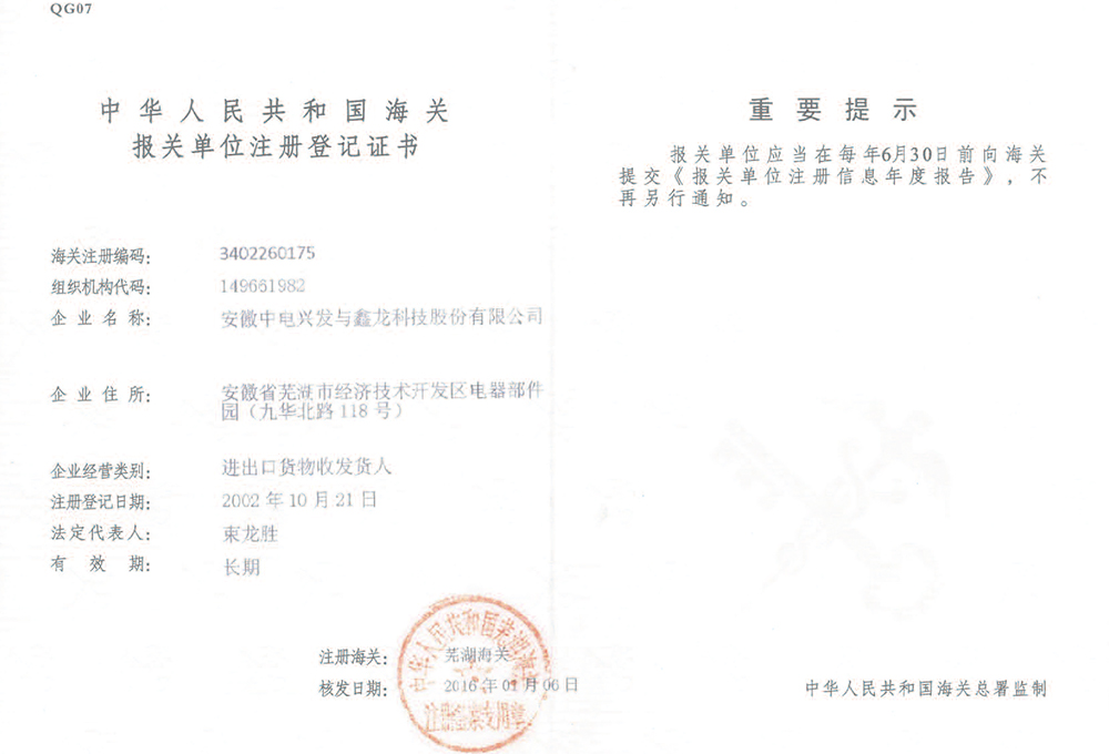 中國(guó)海關(guān)報(bào)關(guān)單位注冊(cè)登記證書